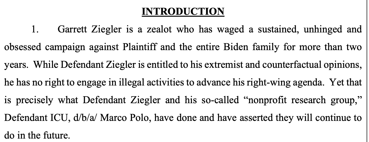 "Plaintiff has selectively elected to litigate claims against the Defendants because they are the parties that published the Biden Laptop Report. Plaintiff's complaint is a textbook case of masquerading seemingly legitimate litigation with the goal of chilling Defendants' free speech rights," Ziegler's lawyers said. "Plaintiff falsely accuses Defendants of being zealots and obsessed with Plaintiff. Defendants' only conduct was to research material from a third party which resulted in the publication of the Biden Laptop Report. The acts Plaintiff complained of were done in furtherance of Defendants' right to free speech."