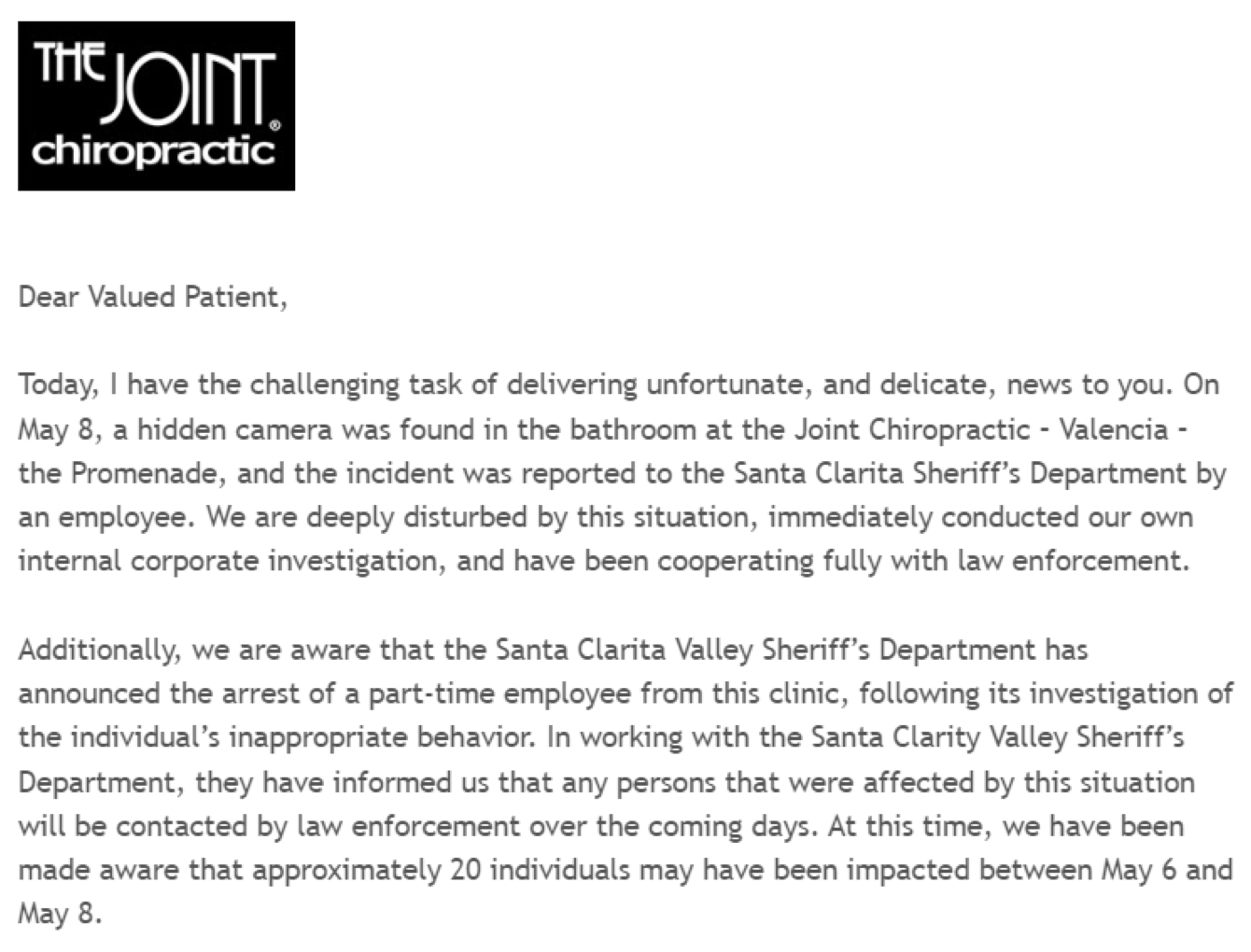 "After learning about this awful criminal act, I have endured panic attacks at other healthcare offices, and I often feel incredibly vulnerable, searching rooms for any hidden cameras. I don't know how I will ever be able to trust a practitioner again," she said. "I did not hear anything from The Joint Chiropractic until June 12th in a mass email that downplayed the fact that there was an arrest and allegations of this perpetrator that involved images of children – potentially my own. I promptly reached out to The Joint Chiropractic's patient relations team that day for help and more information, as I was there one of the days the camera was allegedly in the bathroom. To this day, they have still not responded to me."