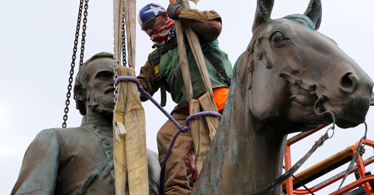 A worker attaches a rope as they prepare to remove the statue of Confederate General Stonewall Jackson from its pedestal on July 1, 2020, in Richmond, Va. (AP Photo/Steve Helber, File)